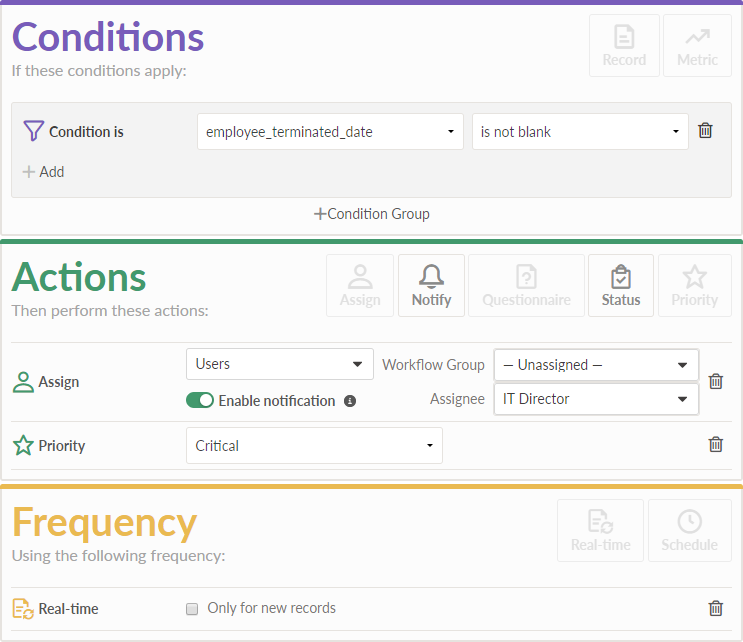 Because incident management may involve different departments or teams that take part in investigating exceptions, workflow groups can also be used to build an incident management workflow based on each department's unique policies and procedures. For example, a Finance team may need to assign a transaction representing an expense policy violation to be reviewed by the manager of the affected department, whereby only a Finance team member will be able to "close” the issue once resolved.