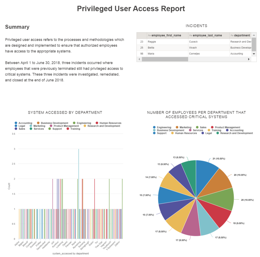 First, you create a filtered table that displays the three critical records identified via trigger. Then, you create visualizations that showcase the critical systems accessed by department, and the number of employees within each department that accessed the critical systems. Finally, you create a storyboard to present your findings in a meaningful way to the relevant stakeholders.