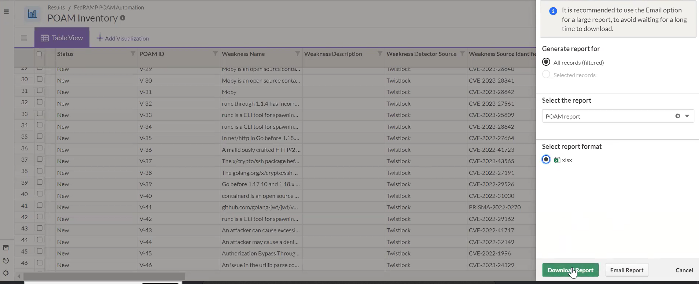 After completing all records and reviewing their statuses, the Impact Report feature is used to export the POAM Inventory into the FedRAMP POAM Excel template. The export automatically sorts open and closed vulnerabilities according to FedRAMP requirements.