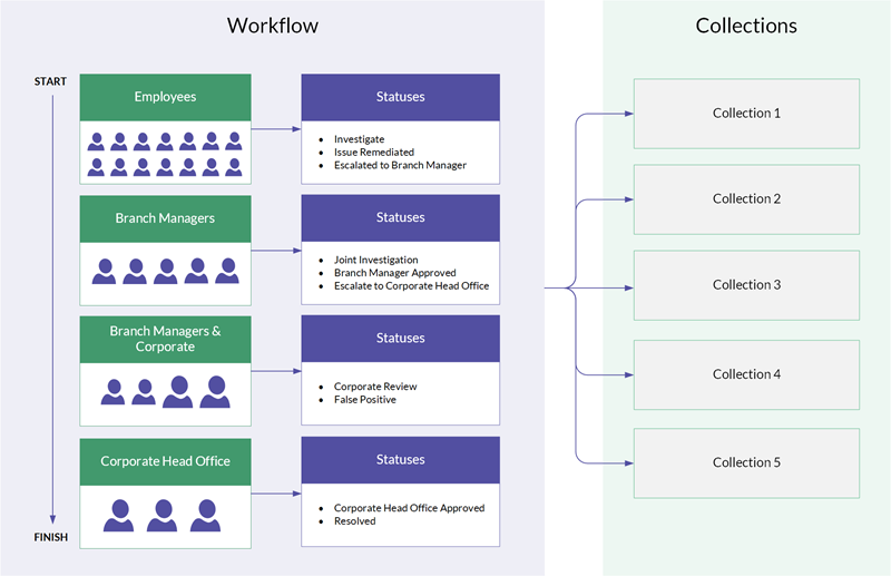 The start to finish arrow indicates generally how records will be moved through the remediation process, starting with employees and ending with corporate head office.