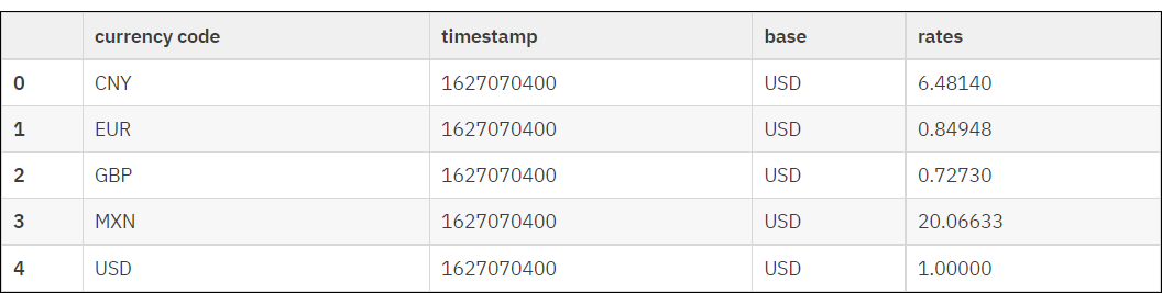 If you used the currency codes in the example above, you now get a dataframe that contains only the exchange rates you specified.