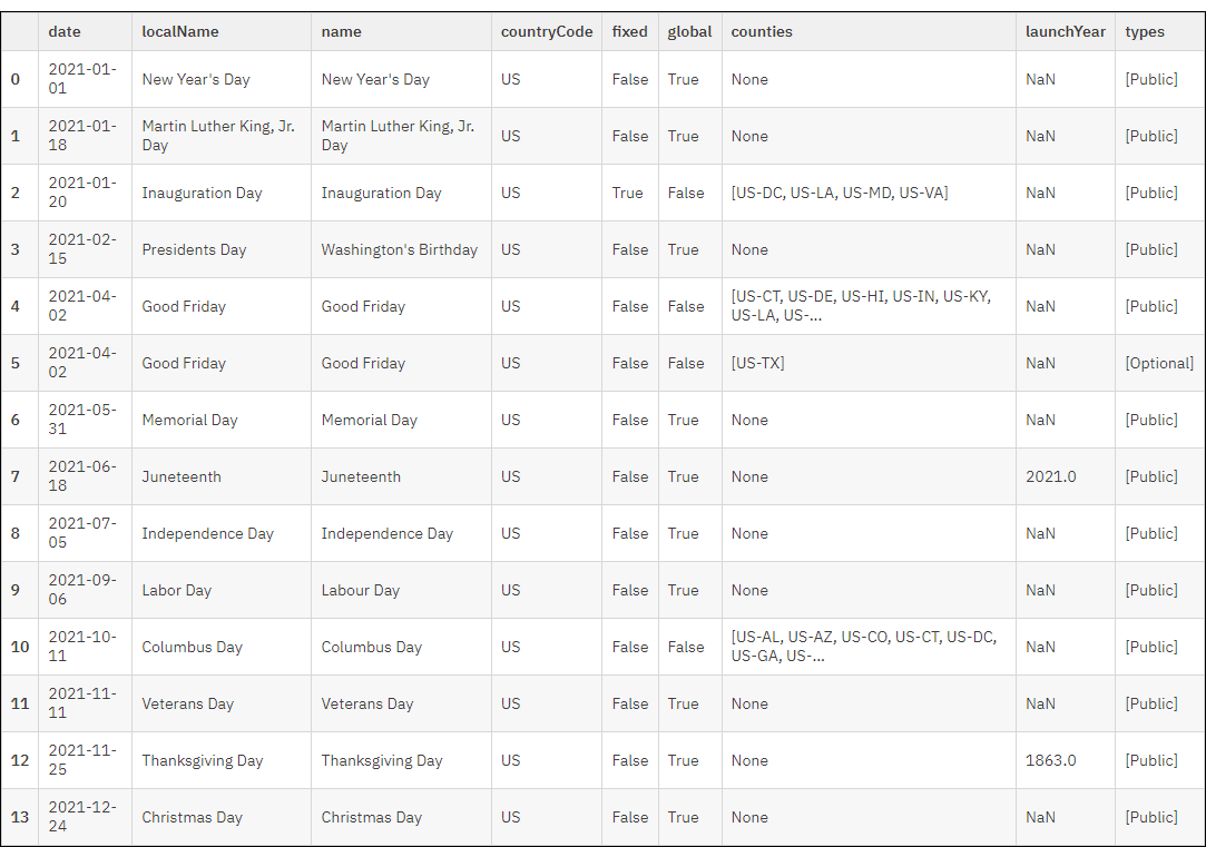 If you didn't update the GET request, all the public holidays in the United States for 2021 are returned. In addition to the actual date on which the holiday falls, other useful information is returned, such as which jurisdictions observe holidays that are not observed in the entire country.
