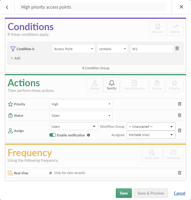 Desea poder configurar un flujo de trabajo de acciones correctivas que realice un conjunto de acciones cada vez que se agregue un nuevo registro a su tabla. Los registros recién agregados deberían procesarse automáticamente, con la prioridad y el estado correctos asignados, en función del punto de acceso que se utilizó.