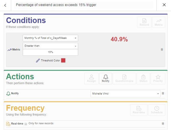 Luego, crea una medida para monitorear el porcentaje total de acceso a las instalaciones durante el fin de semana. Finalmente, crea un disparador que le notificará cuando el porcentaje de acceso durante el fin de semana exceda el 15 %.