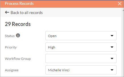 Una vez que los registros estén disponibles, puede procesarlos. Procesar un registro le permite proporcionar información clave sobre un registro, como la prioridad, el estado y a quién está asignado. También puede agregar comentarios y adjuntar archivos. Puede procesar los registros en un estudio analítico de datos de forma individual, en grupos o todos a la vez.