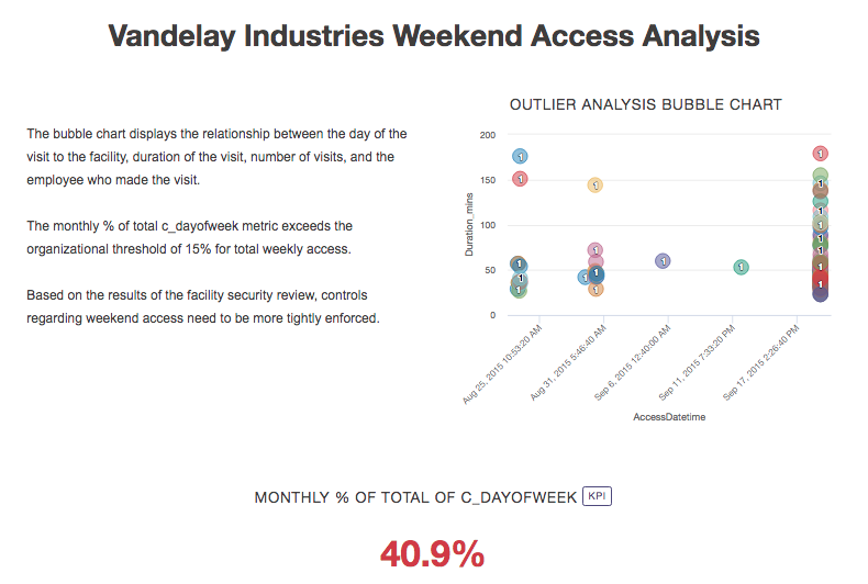 En función de los resultados de su revisión y de la visualización y la medida que creó, considera que los controles relacionados con el acceso el fin de semana deben aplicarse con más rigor. Desea aunar su análisis en un storyboard para contar la historia de la revisión de la seguridad y utilizar los datos para convencer a su gerente de que implemente un mayor control.