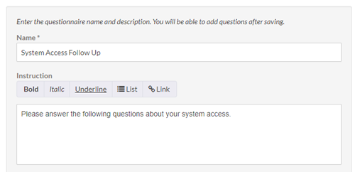 - En la sección Administrar cuestionarios, haga clic en Agregar y proporcione un nombre e instrucciones para el cuestionario.