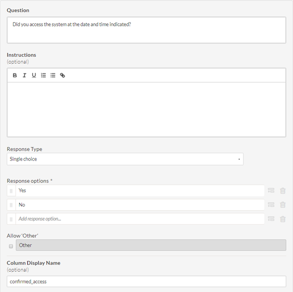 - Haga clic en Agregar e incluya una pregunta de opción única que le interroga al empleado si accedió al sistema en la fecha y hora indicadas.