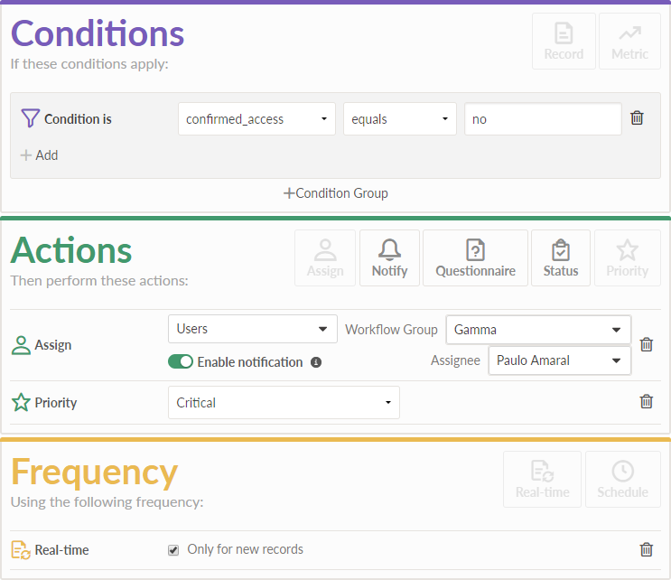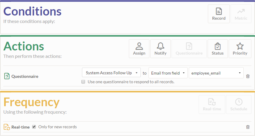 - Configure un disparador en tiempo real sobre el registro con una condición que compruebe si la respuesta del cuestionario fue "No" y realice las siguientes acciones cuando se actualizan los registros: