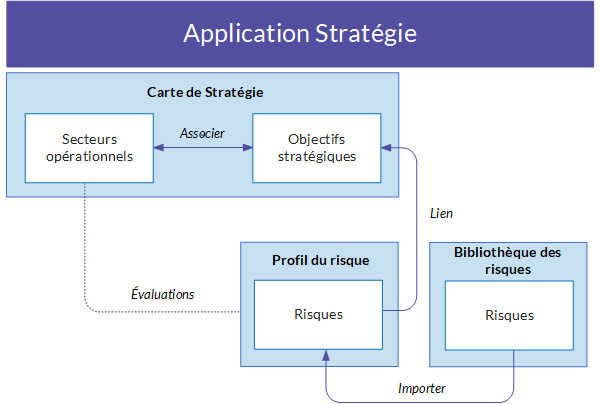 Dans la carte Stratégie, vous pouvez associer des secteurs opérationnels et des objectifs stratégiques. Dans le profil de risque, vous pouvez lier des risques aux objectifs stratégiques définis dans votre carte Stratégie afin d’évaluer les risques et visualiser les agrégations de risques.
