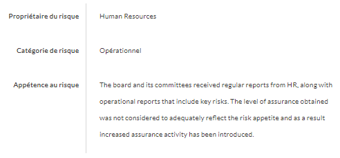 Commencez par définir une série de champs d'attributs de risque qui s'appliqueront à chaque risque identifié. Ensuite, vous caractérisez et catégoriser chaque risque à l'aide des attributs de risque définis. Par exemple, vous caractérisez le risque Perte du meilleur talent comme suit :