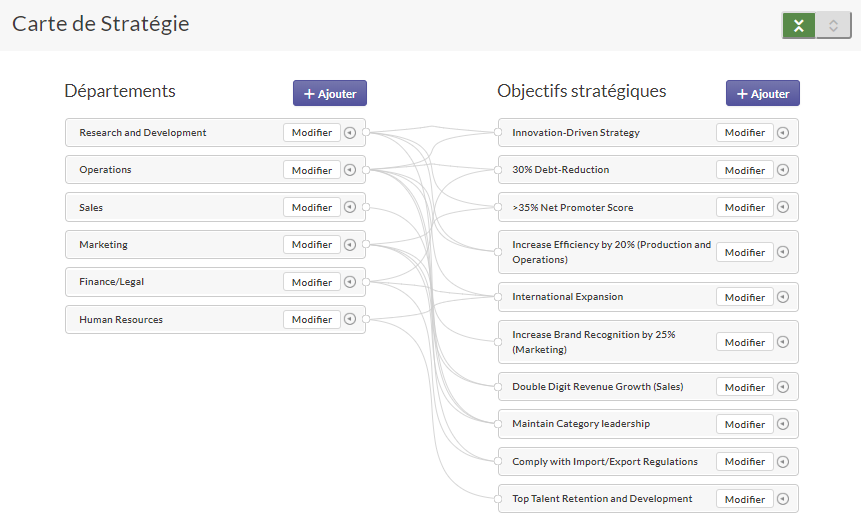 - La carte Stratégie représente la structure de l'entreprise et de l'entité juridique de votre organisation dans deux colonnes qui illustrent les secteurs opérationnels et les objectifs stratégiques.