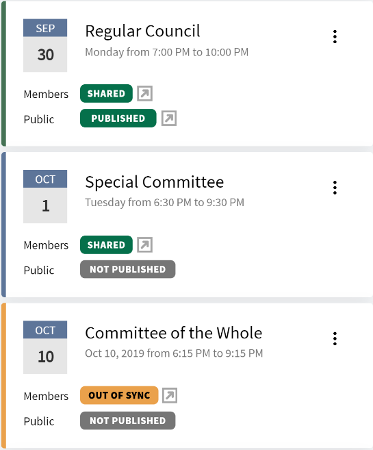 The agenda is shared with group members and admins and published on the Public site. The shared and published agenda is the current version. |