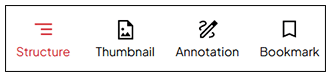 A row of icons allows you to choose what book feature you prefer to display in the panel. By default, the Structure view is selected.