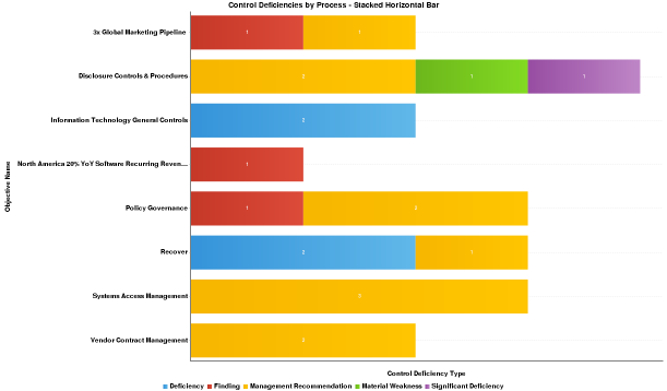 Você precisa visualizar seus pontos pertencentes às deficiências de controle pelo processo. Usando um gráfico de barras horizontais empilhadas, é possível visualizar cada processo e demonstrar claramente as informações de deficiência do controle associado: