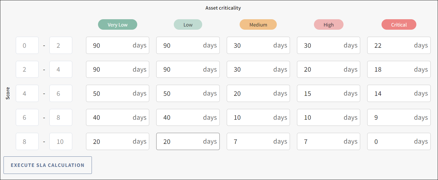 这个数字表示解决漏洞/发现所需的最大天数。例如:在上面的屏幕截图中,如果分数在 8-10 之间,并且资产关键性为“高”,则 SLA 为 7 天。 - 选择保存更改。