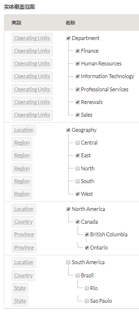 在管理实体下,您根据适用于这两个项目的部门、地区和位置为业务结构建模: