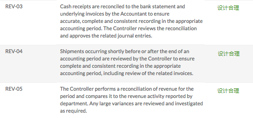 - REV-03 会计将现金收据与银行对账单和基础发票进行核对,以确保在适当的会计期间准确而完整一致地记录。管理会计审核对账并批准相关日记账分录。
