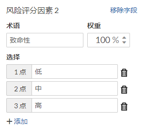 单击添加风险评分因素,如下填写风险评分因素 2 部分,然后向下滚动页面并单击保存: