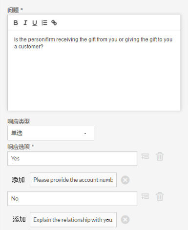 您想部署一项调查,向销售代表了解代表您公司所赠送礼物的收件人。具体来说,您想收集有关非客户的礼品收件人的信息。