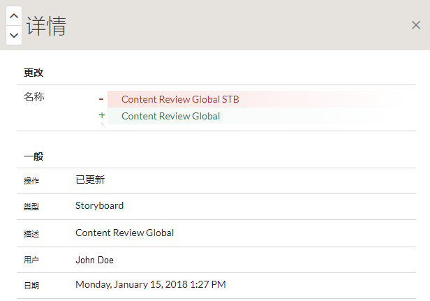 大多数活动日志条目显示操作发生前后的条目之间的确切区别,以便您清楚地了解所发生的变化。但是,解释和 Storyboard 配置的更改目前不包含差异信息。
