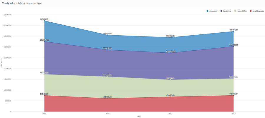 使用四年期间的汇总销售数据,揭示随时间推移不同的客户群体在整体销售中的比例趋势。为此,您可以创建一个堆叠面积图,显示该期间的趋势: