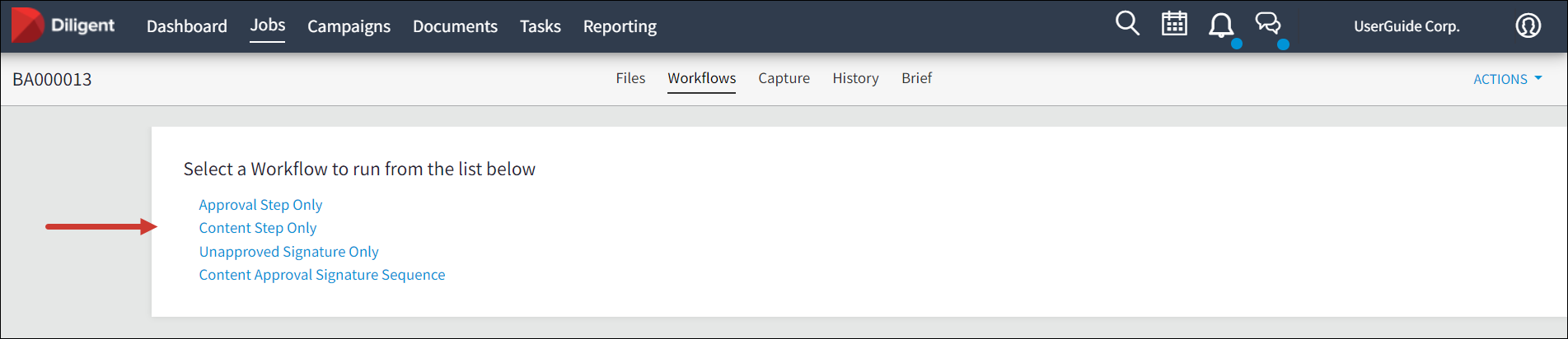 Select the job and go to the Workflows tab. The Workflows available to you will depend on the Job Type selected when it was set up.