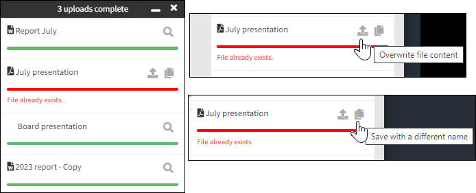 A red bar indicates that the file already exists. You can choose to Save with a different name or Overwrite file content by selecting one of the icons on the notification.
