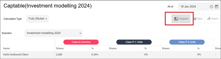 Cap table compare mode: After you create one or more scenarios, you can leverage the Compare feature. You can look at multiple cap tables simultaneously and review the data within.