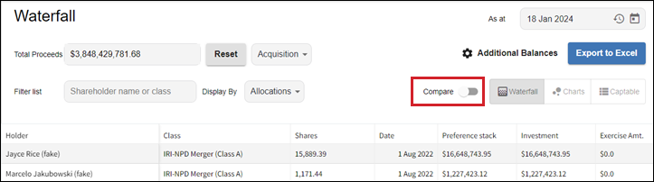Waterfall compare mode: You can see how the scenario you created impacts distributions in the event of an acquisition or IPO.