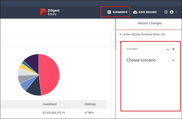 Use the Next Round Scenario tool in Diligent Equity to run what-if scenarios to model the effects of future rounds of financing on the company's capitalization. When you are in Scenario mode the scenarios you have created can be viewed in the Securities section on your navigation bar.
