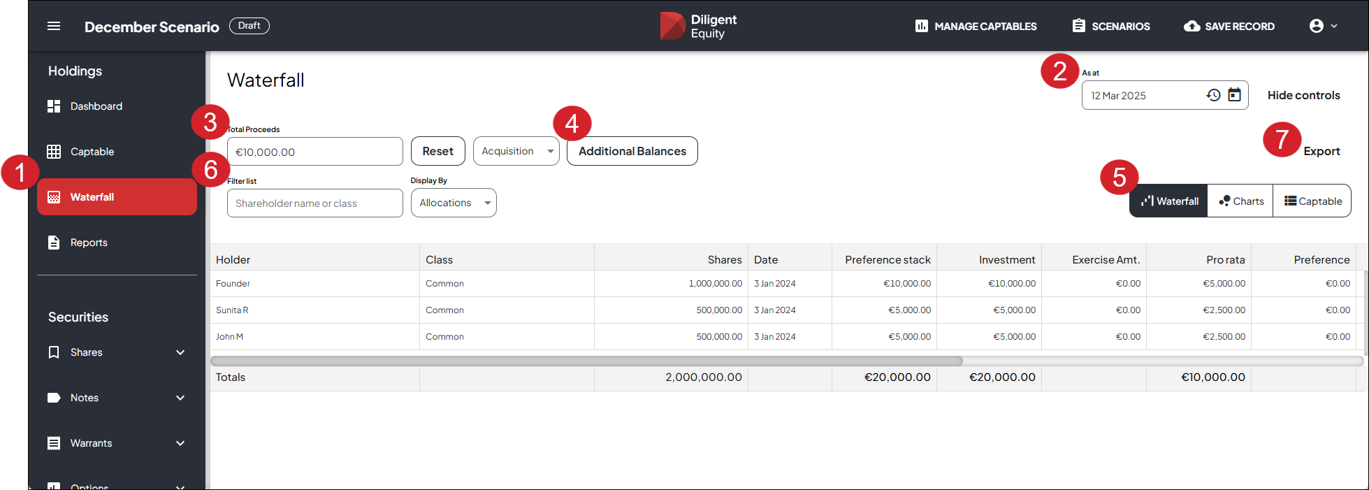 Here we look at your C corp Waterfall view and its features. If your company is set up as an LLC you will have additional features. For more information, go to About Limited Liability Company waterfall.