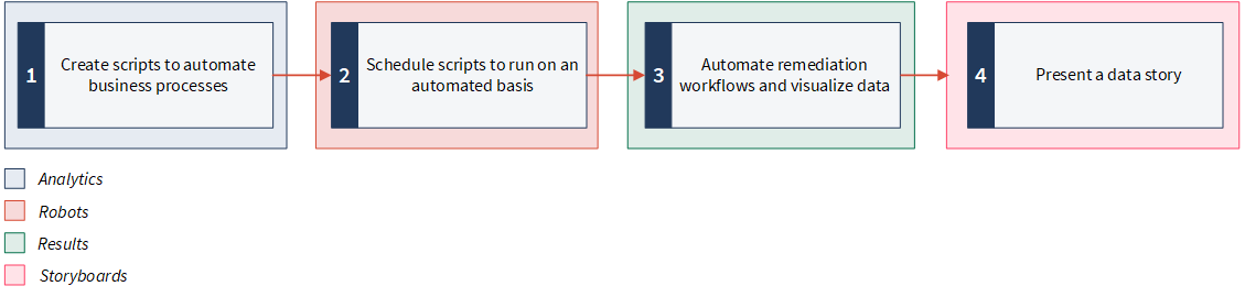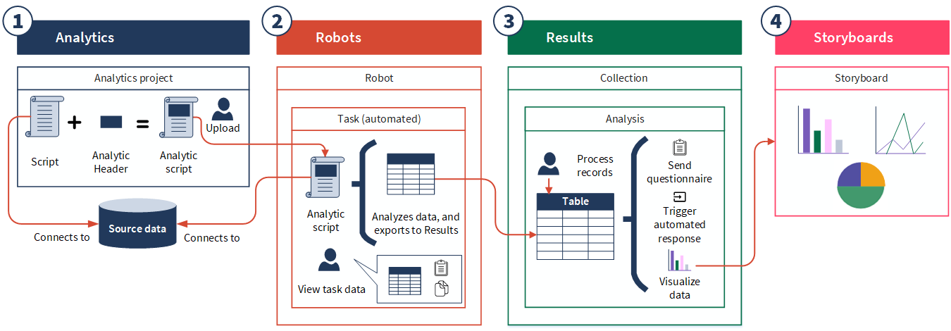 You can create scripts in Analytics to automate importing, preparing, analyzing, and exporting data. You can then take a script that you run ad hoc in Analytics, convert it to an analytic script (by adding an analytic header), and upload the script to Robots to run tasks on an automated basis.