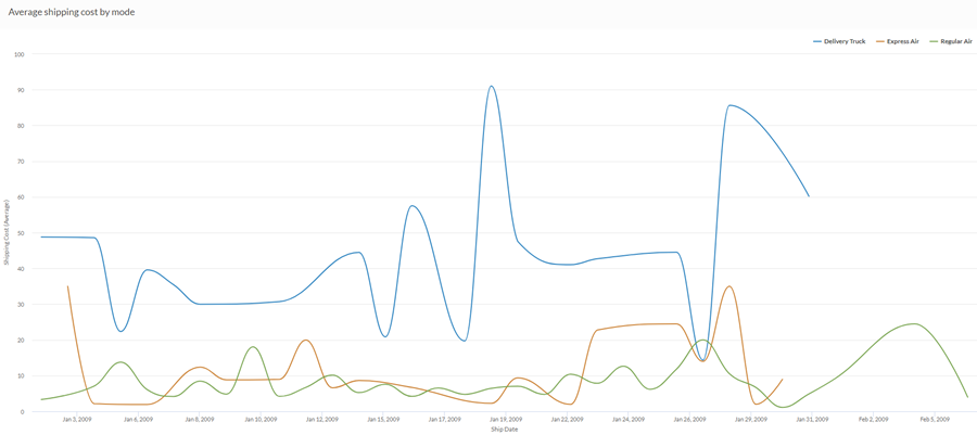 Using last month's sales data, you want to show the trend of average shipping cost for each shipping method your company employs. To do this, you use a line chart that groups each series by shipping method: