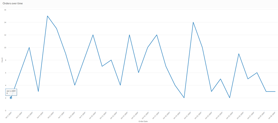 Using last month's sales data, you want to show the trend of orders placed over time. To do this, you use a line chart that plots the count of orders: